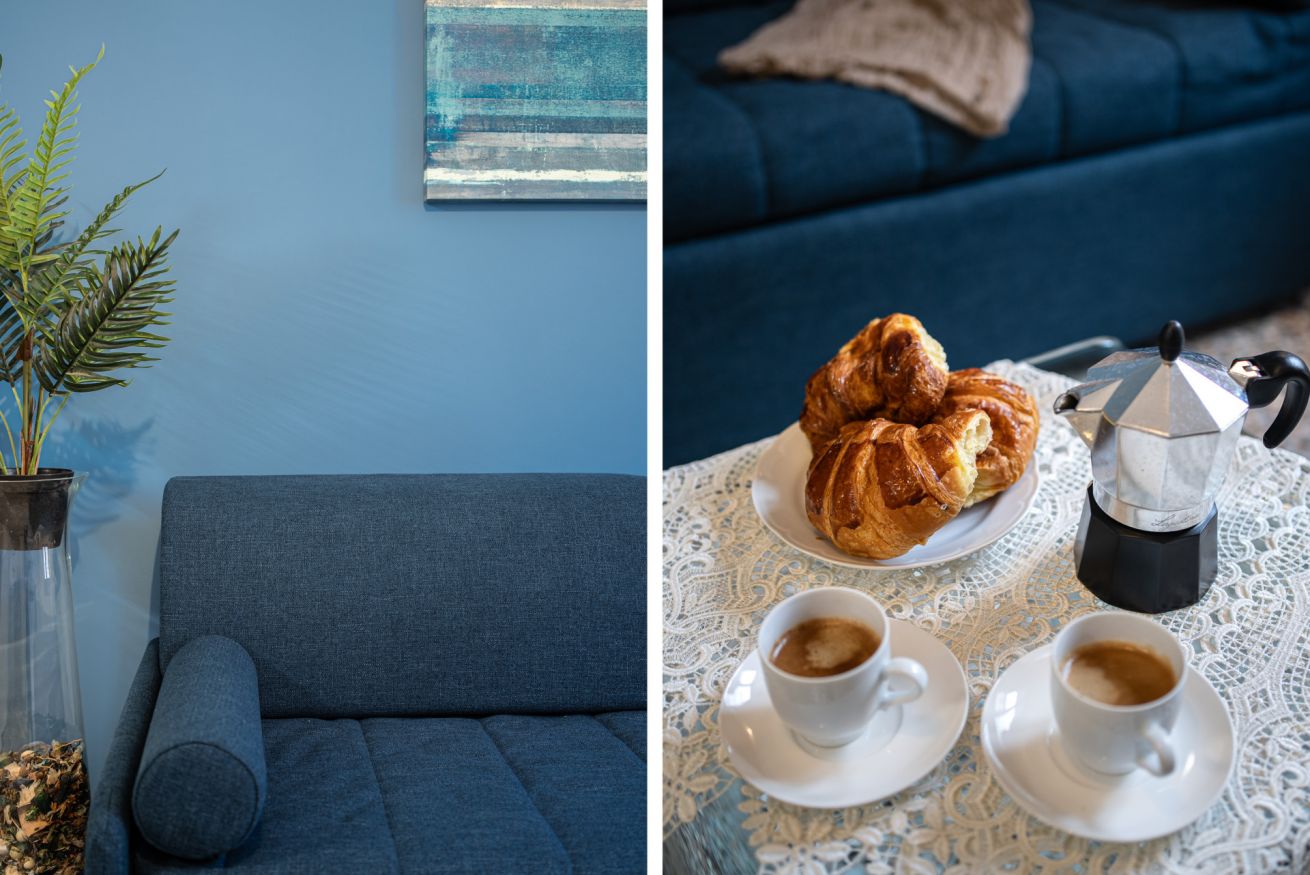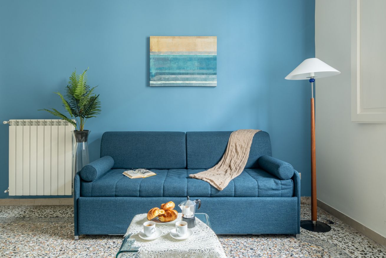 Un soggiorno luminoso con un comodo divano letto, dove poter rilassarsi dopo una giornata di visite turistiche.