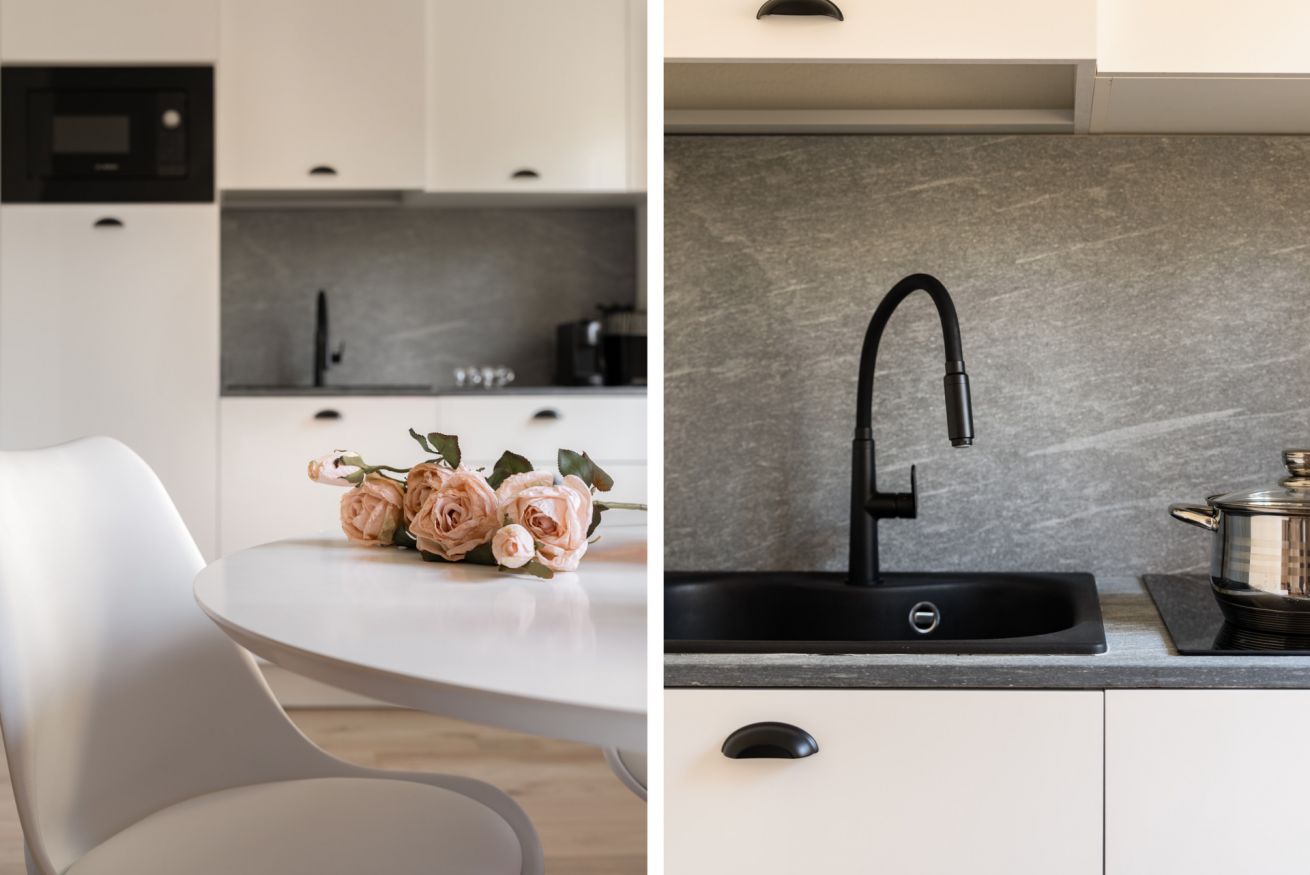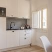 Una luminosa zona living con un divano confortevole e una cucina moderna, dotata di tutto il necessario per preparare piatti gustosi.