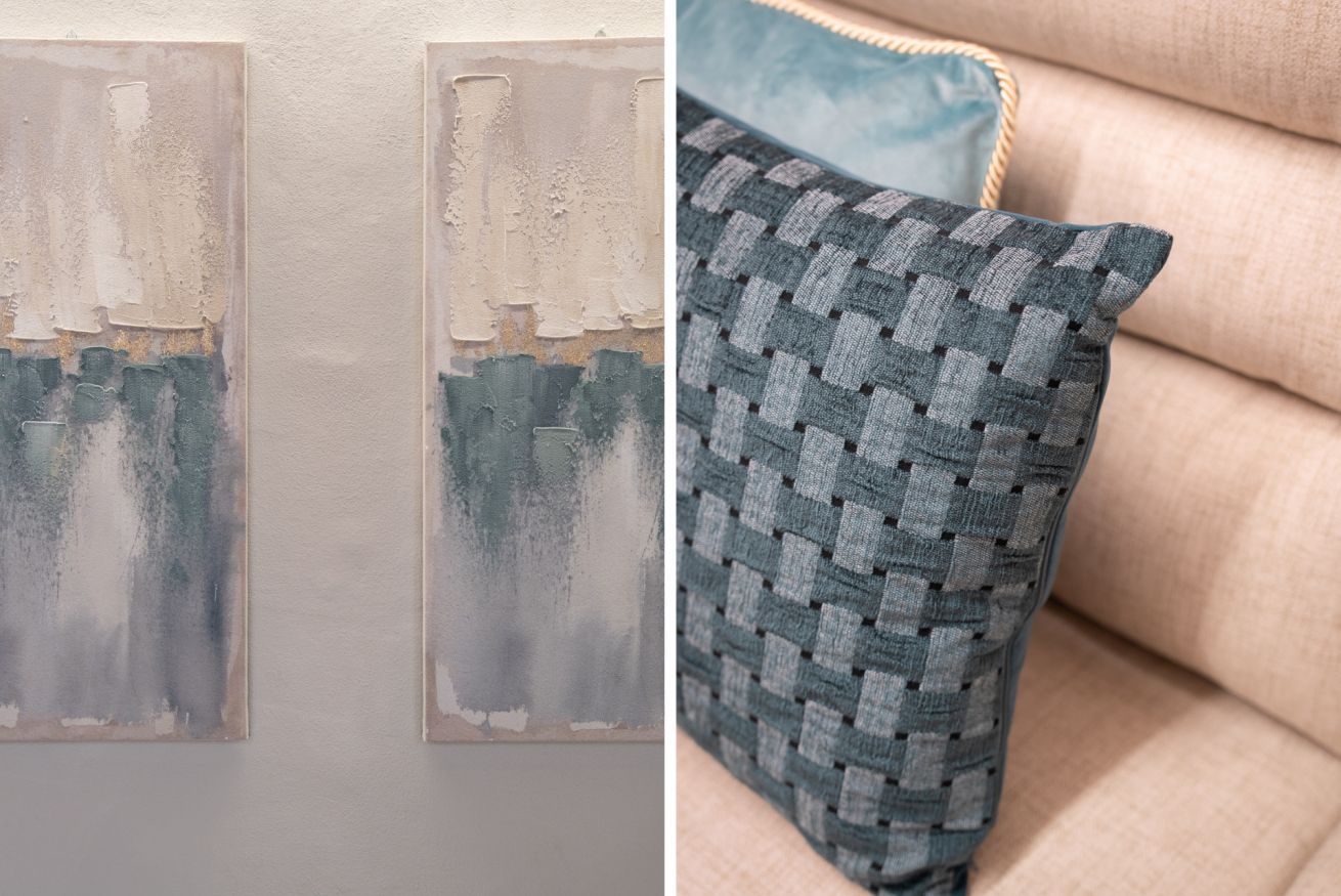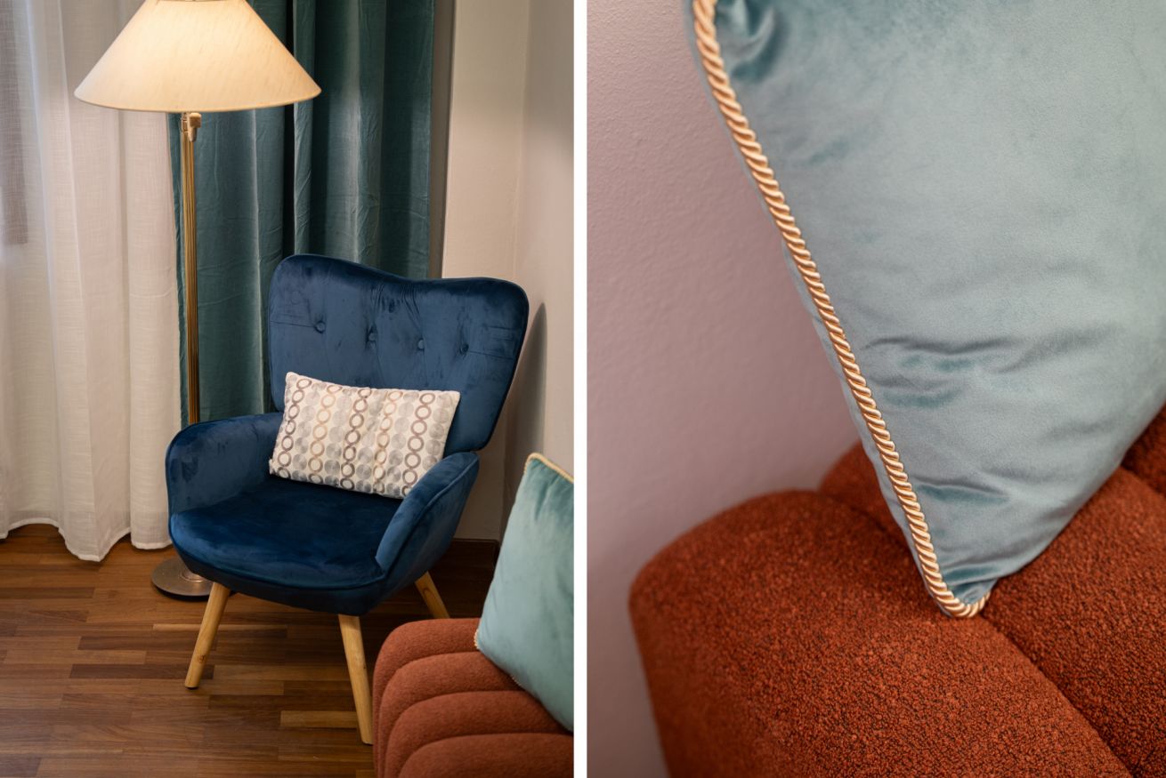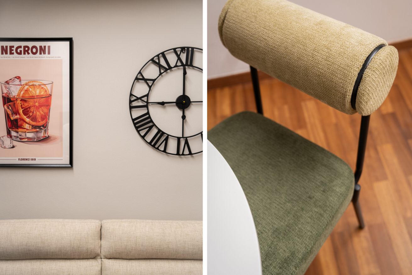 L'appartamento si apre su un accogliente soggiorno con zona pranzo e angolo lettura, arredato con toni caldi e dettagli moderni. Il comodo divano si trasforma in un letto matrimoniale per ospitare fino a 4 persone.