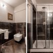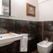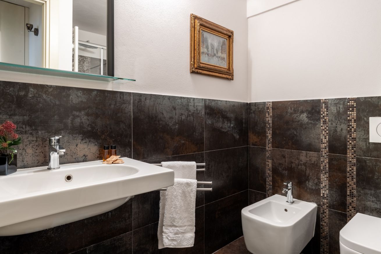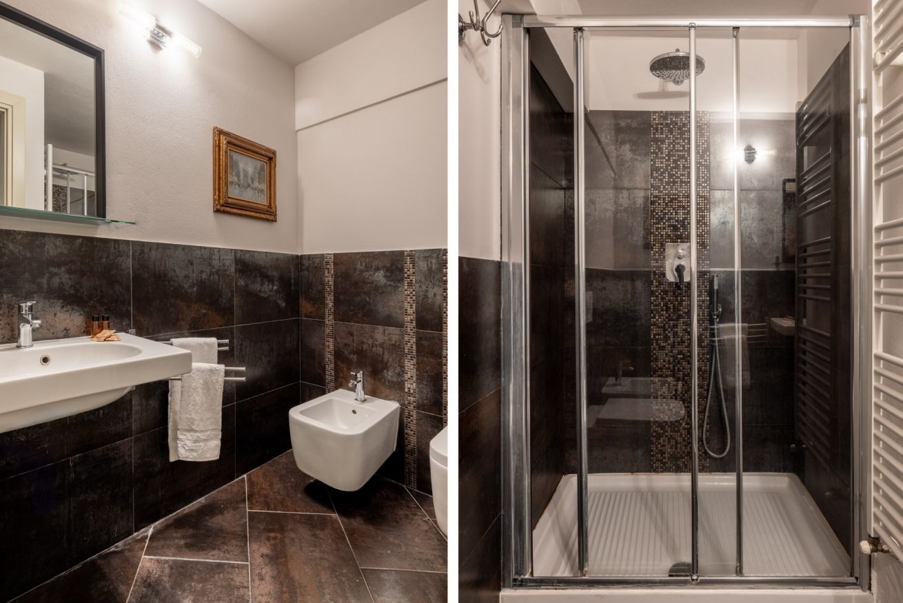Il bagno, elegante e funzionale, dispone di una comoda doccia e della lavatrice, ideale anche per soggiorni prolungati.