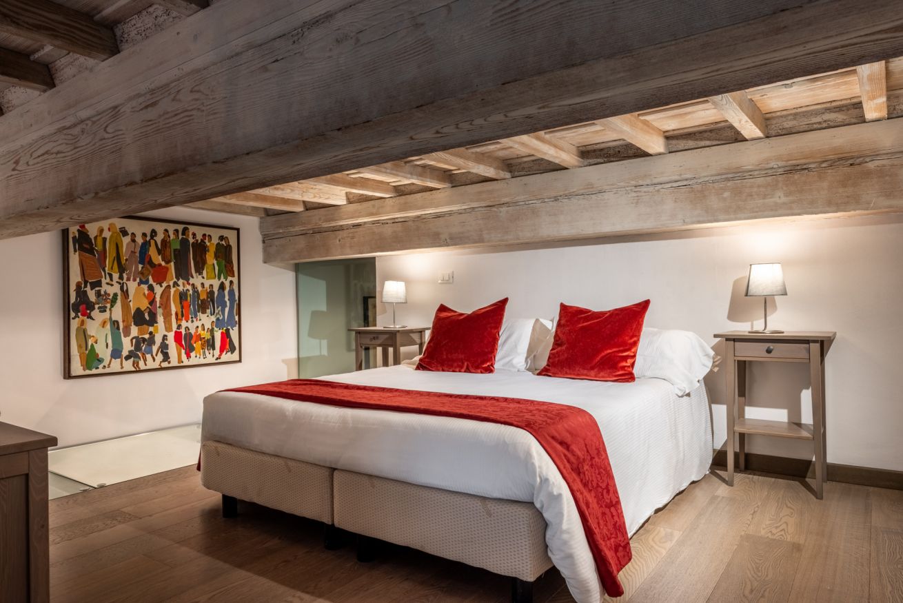 Al piano superiore si trova la seconda camera, situata su un caratteristico soppalco dall’altezza più contenuta, resa intima e suggestiva dalle travi in legno a vista.