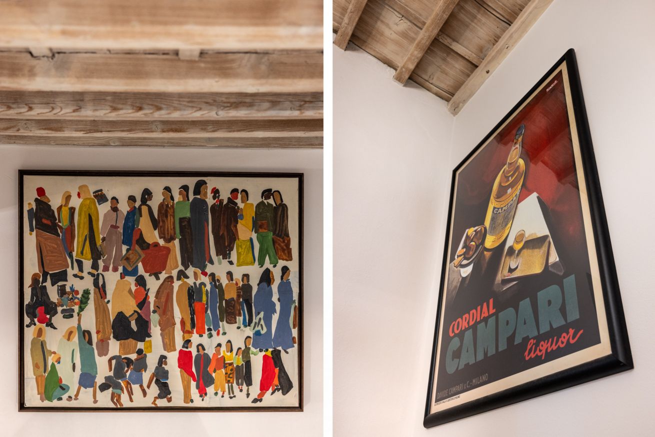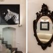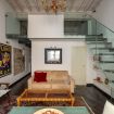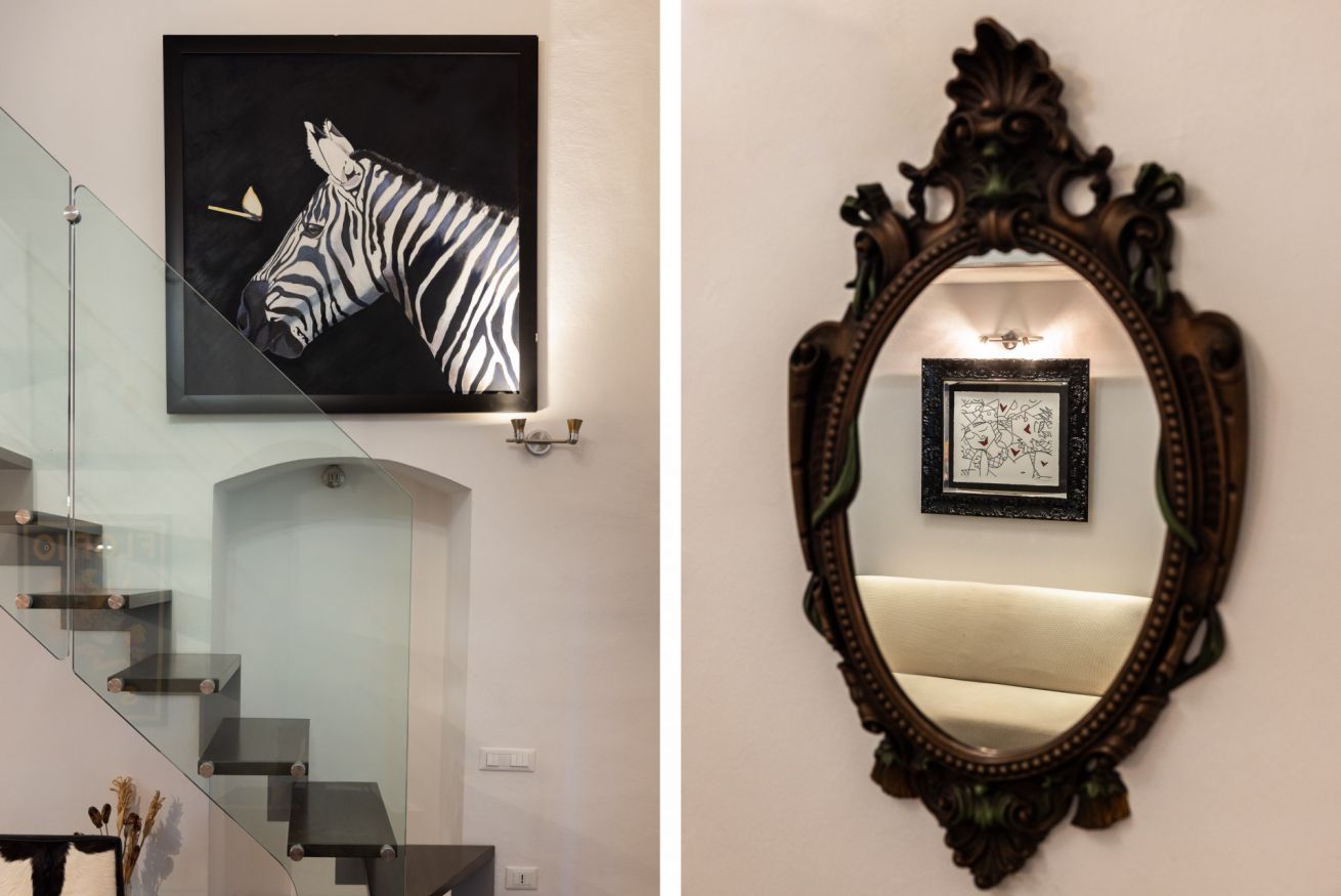 Il soggiorno è arioso e ricco di carattere: opere d’arte, un elegante mix di materiali e una scala in vetro conducono al soppalco, creando un ambiente unico e di grande personalità.