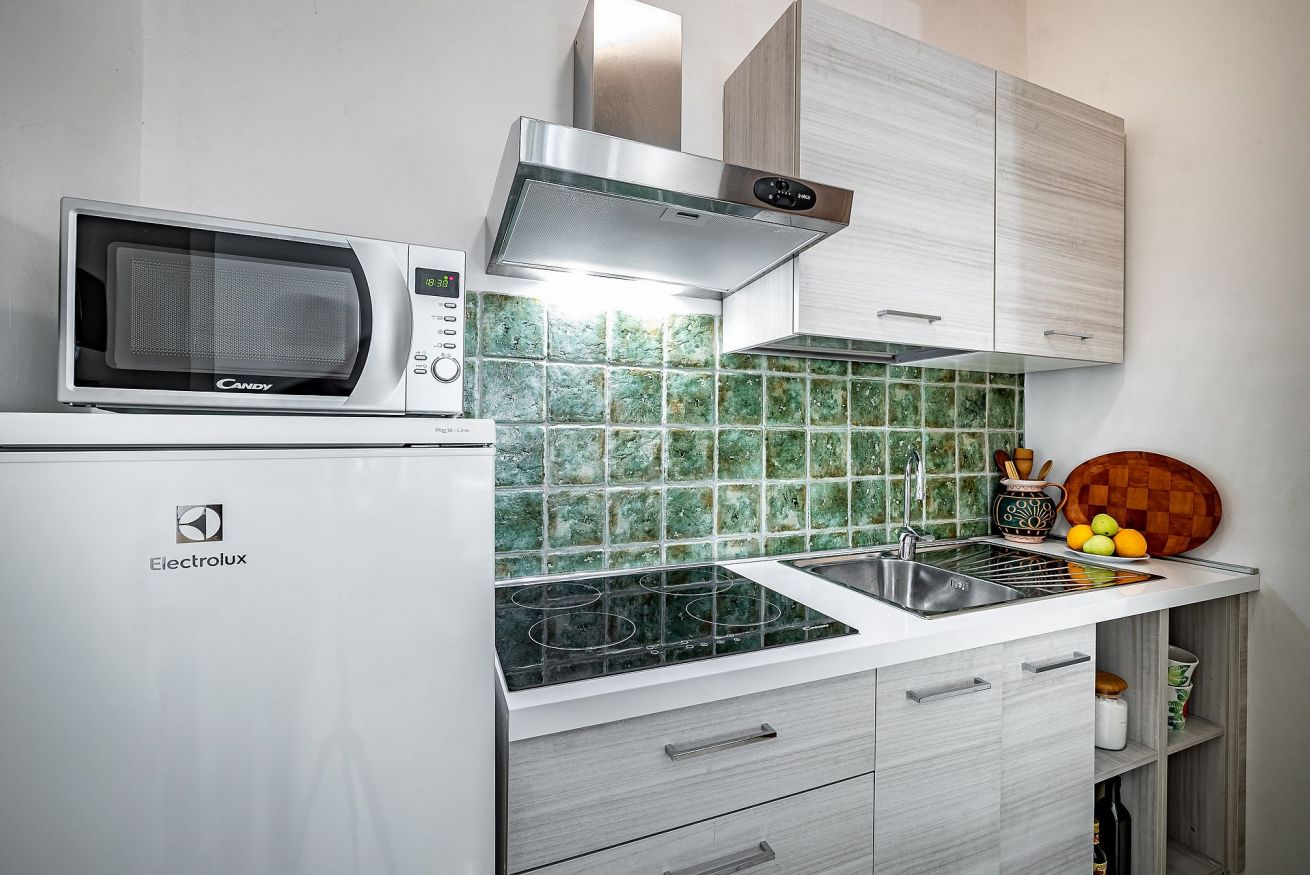 La cucina compatta è attrezzata con piano a induzione, microonde, bollitore e macchina del caffè, perfetta per preparare colazioni o cene.