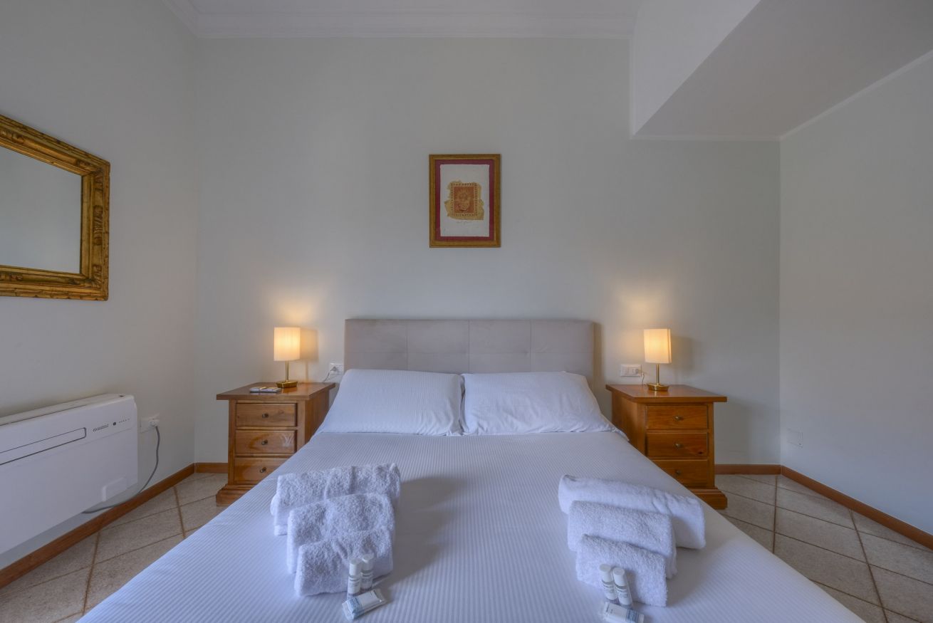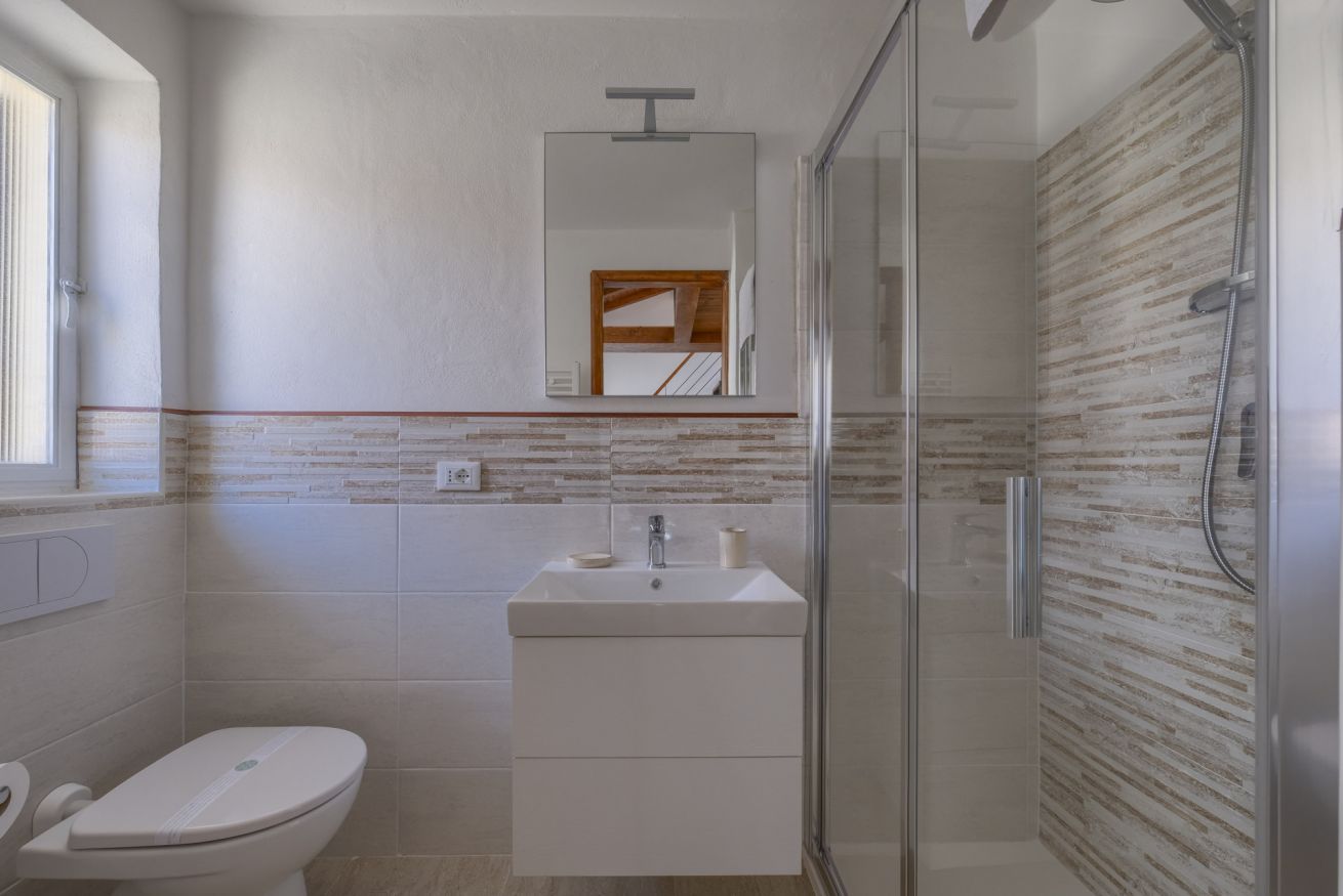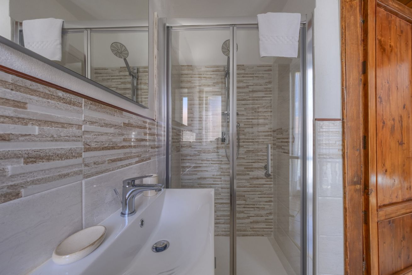Il primo piano ospita anche una delle due camere da letto, arredata con un confortevole letto matrimoniale e ampi armadi per riporre i vostri effetti personali. Adiacente alla camera, troverete uno dei due bagni, moderno e funzionale, con doccia spaziosa, asciugamani soffici e prodotti di cortesia.