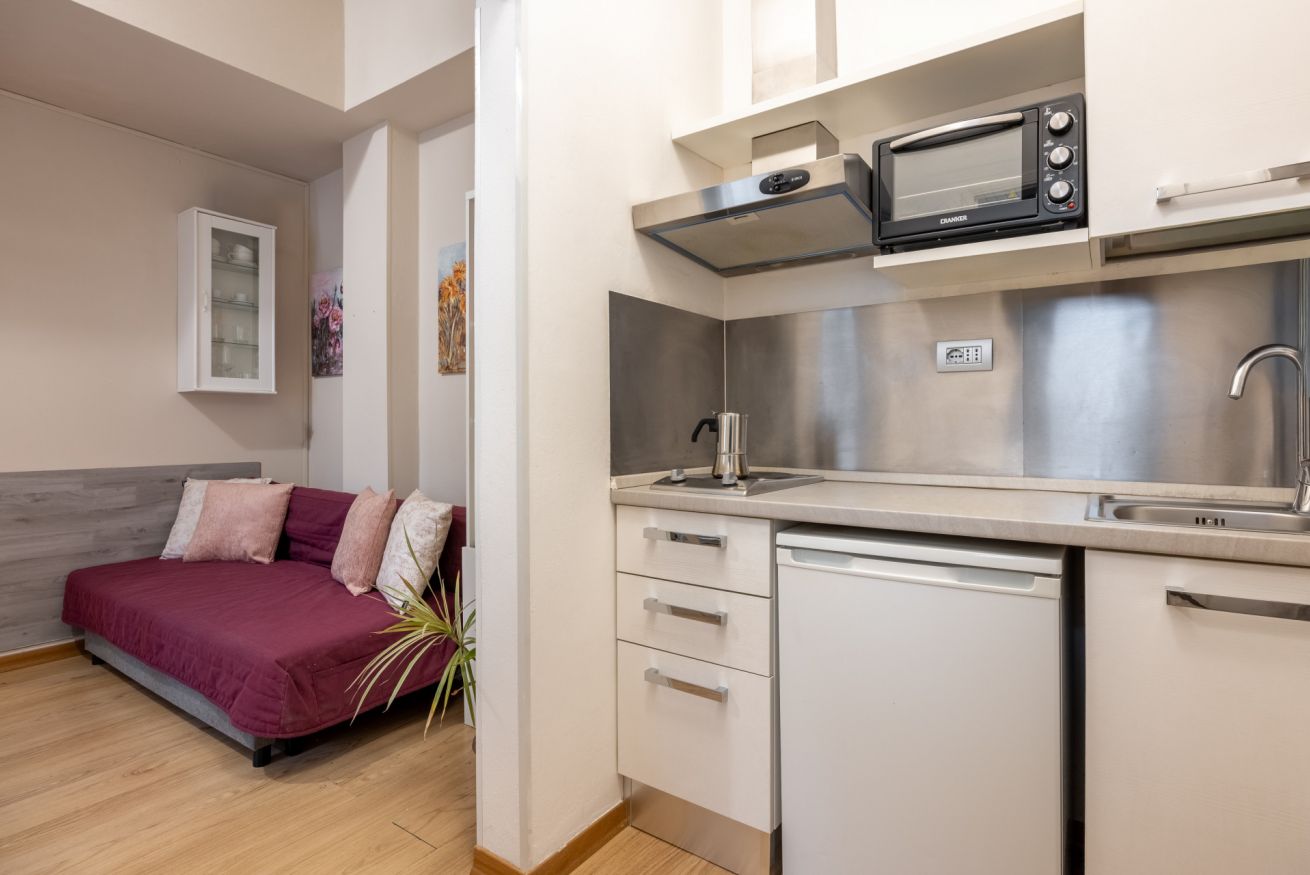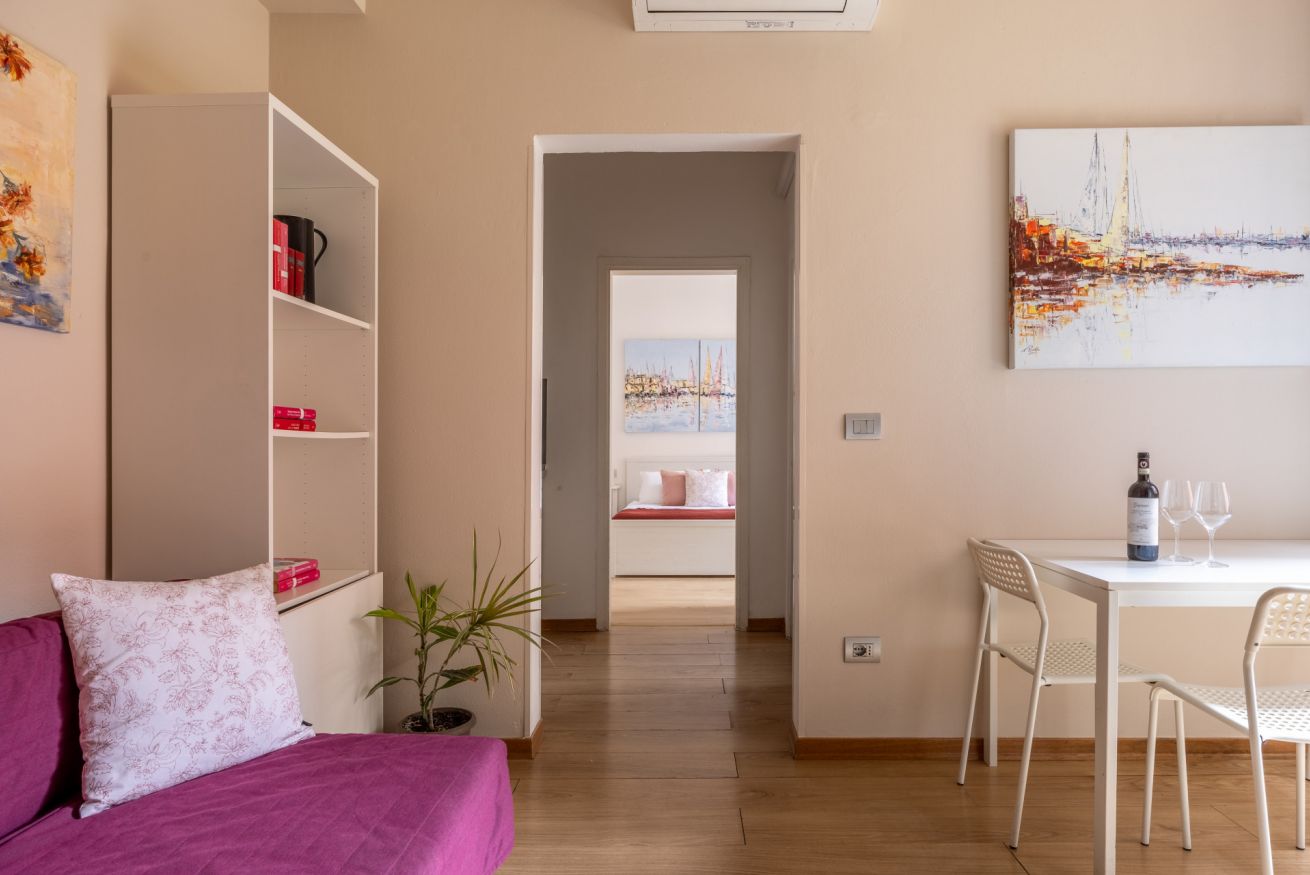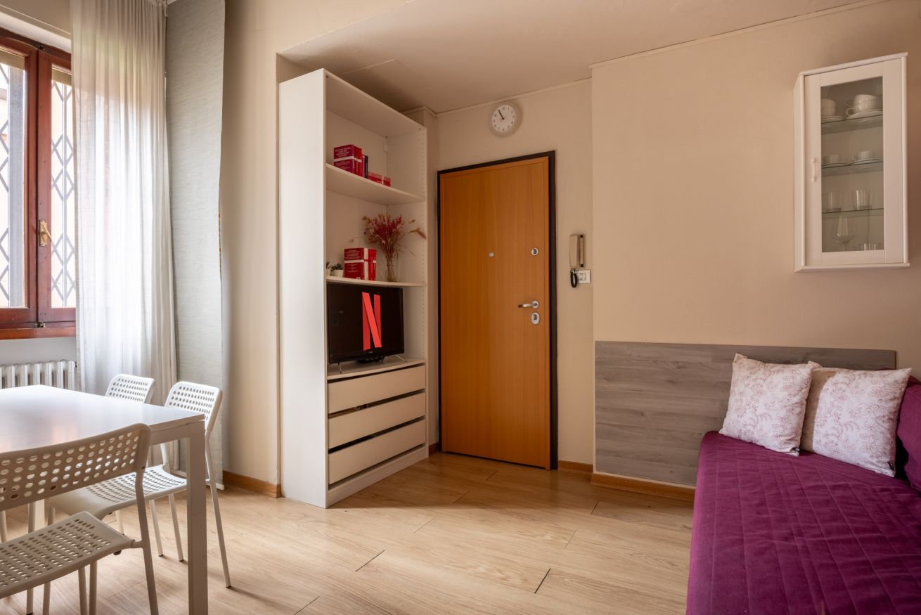La zona giorno è accogliente e luminosa, arredata con uno stile essenziale e contemporaneo. Il soggiorno dispone di un comodo divano letto, TV e zona pranzo, ideale per rilassarsi dopo una giornata trascorsa a esplorare la città.