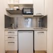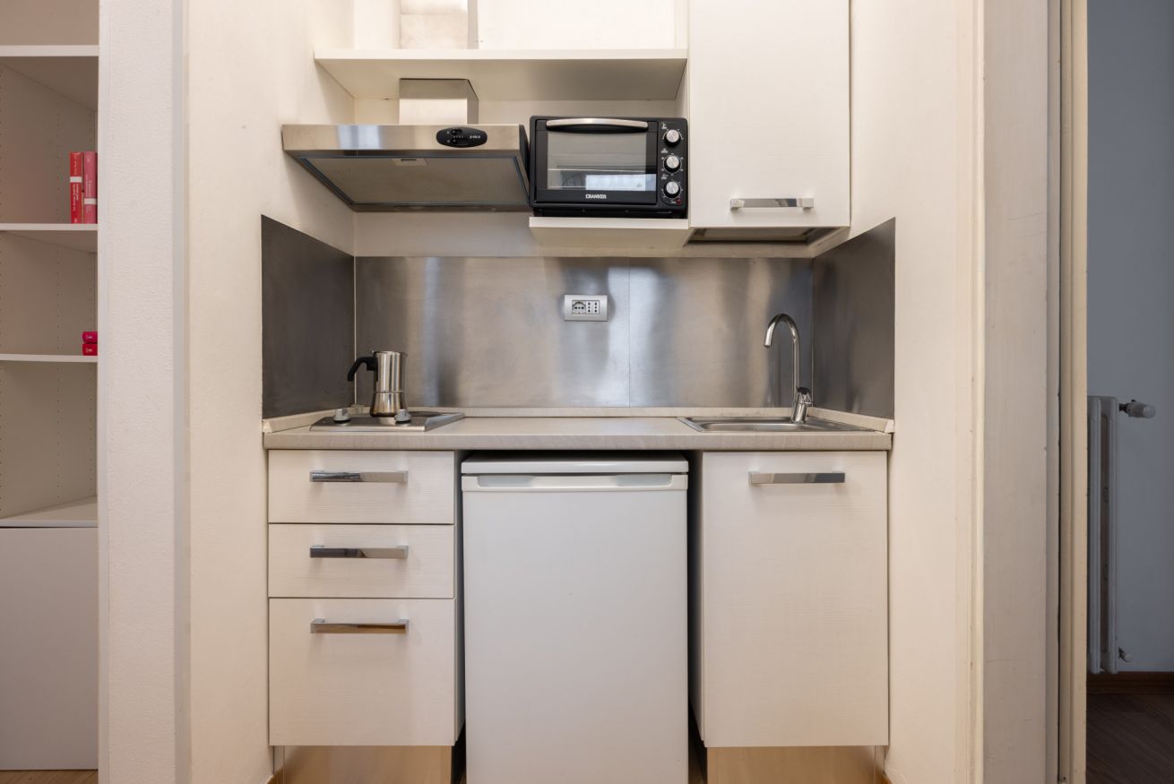 La cucina, compatta e funzionale, è dotata di un piano cottura a due fuochi, forno a microonde, piccolo frigorifero, macchina da caffè, bollitore e stoviglie.