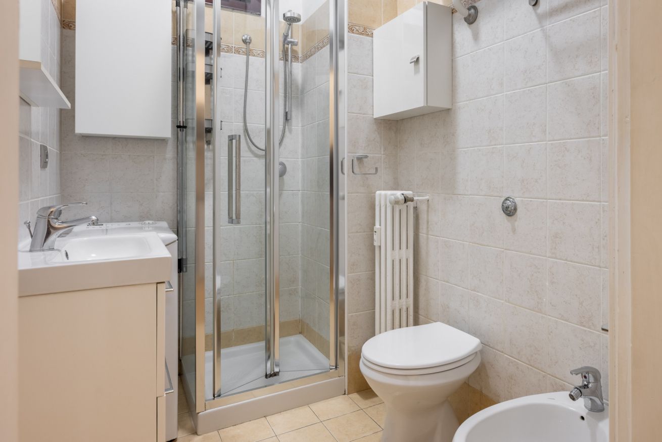 Il bagno, moderno e funzionale, è completo di doccia, set cortesia, asciugamani e asciugacapelli.