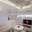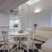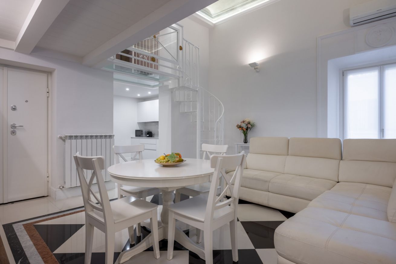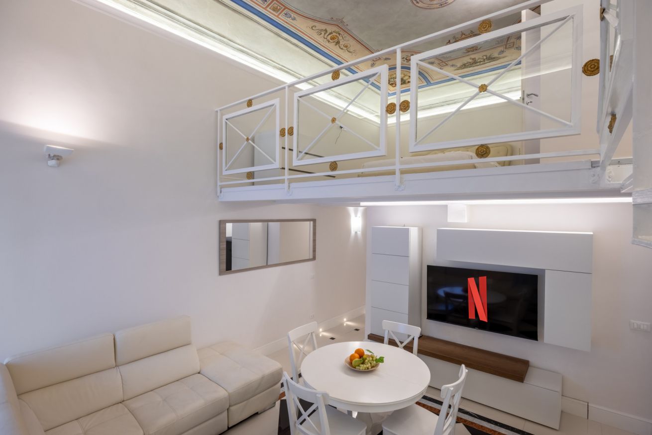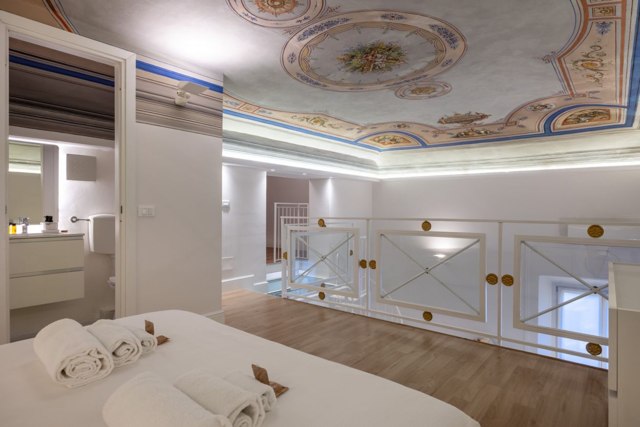 Il soggiorno è ampio e curato nei minimi dettagli, con un comodo divano e una zona pranzo ideale per condividere momenti conviviali. Da qui, una scala a chiocciola bianca conduce al soppalco, dove si trova una seconda camera matrimoniale immersa sotto un soffitto affrescato di rara bellezza.