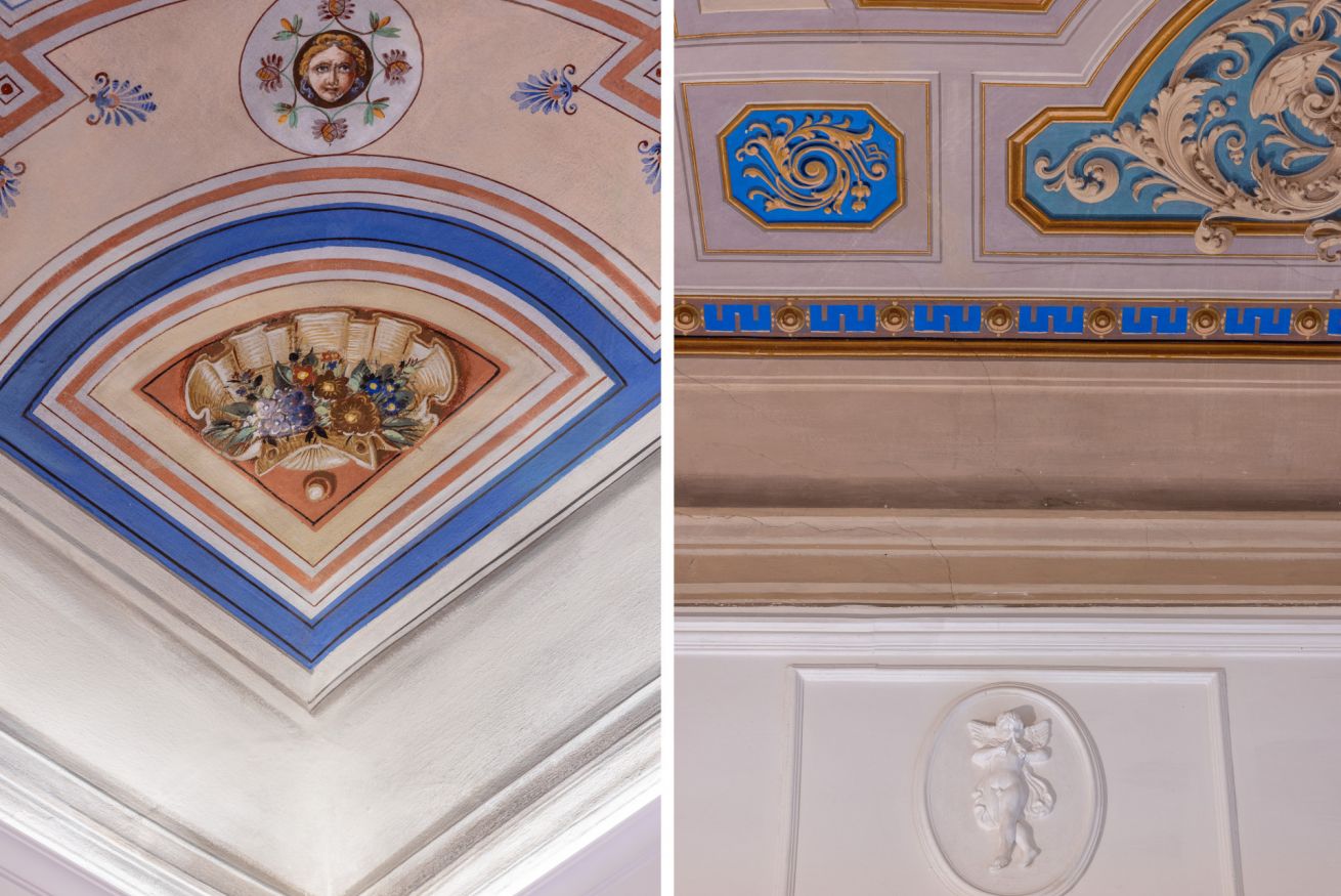 Gli spazi luminosi e le finestre ampie creano un ambiente accogliente e rilassante, arricchito da preziosi soffitti decorati a mano che rendono ogni stanza unica.